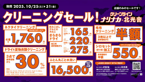 CLEANLINEナリナカ・北光舎 10月25日(土)~10月31日(金) クリーニングセール